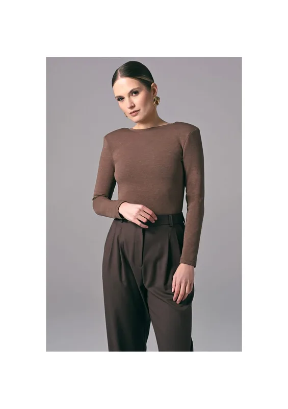 Body Power Back – ciemno beżowe eleganckie body damskie z długim rękawem do pracy
