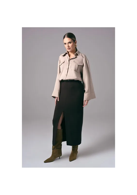 Brązowa spódnica damska Power Ease z dzianiny wiskozowej. Komfort, uniwersalność i codzienna elegancja do pracy. Spódnica Power Ease to elegancka spódnica damska midi do pracy zaprojektowana w duchu nowoczesnego power dressingu. Prosta, ołówkowa forma oraz strukturalna dzianina porządkują sylwetkę, nie ograniczając swobody ruchu. To model stworzony do codziennego noszenia – w pracy, po pracy i w bardziej swobodnych stylizacjach. DLACZEGO DZIAŁA Prosty, ołówkowy krój Buduje spokojną, uporządkowaną linię sylwetki i sprawdza się w stylizacjach biznesowych oraz casualowych. Średni stan z elastycznym pasem Szeroka, 3-centymetrowa guma w pasie zapewnia komfort i dobre dopasowanie bez uczucia ucisku. Rozporek z przodu Rozporek sięgający nad kolano zwiększa swobodę ruchu i sprawia, że długość midi pozostaje funkcjonalna. Minimalistyczna konstrukcja Czysta forma bez zbędnych detali pozwala łatwo łączyć spódnicę z koszulą, t-shirtem lub marynarką. MATERIAŁ Spódnica została uszyta z mięsistej, strukturalnej dzianiny wiskozowej dobranej pod realne użytkowanie. Materiał: – jest grubszy i stabilny – dobrze trzyma formę – jest miękki i komfortowy – delikatnie się gniecie, głównie podczas przechowywania, nie w trakcie noszenia SKŁAD wiskoza 70% poliamid 25% elastan 5% ROZMIAR I DOPASOWANIE Spódnica ma fason regular i została zaprojektowana tak, aby dobrze układać się na sylwetkach w rozmiarach S–L. S – polecany dla osób noszących XS/S M – polecany dla osób noszących S/M L – polecany dla osób noszących M/L Jeśli wahasz się między dwoma rozmiarami — wybierz mniejszy. WYMIARY: Wymiary mierzone na płasko Odpowiednio dla rozmiarów: S | M | L Długość: 86 cm | 88 cm | 89 cm Szerokość w pasie: 36 cm | 38 cm | 40 cm Szerokość w biodrach: 44 cm | 46 cm | 48 cm Wysokość rozporka: 50 cm | 50 cm | 50 cm Modelka ma 173 cm i nosi rozmiar S. SZCZEGÓŁY TECHNICZNE Długość: midi (bliżej kostki) Krój: prosty, ołówkowy Stan: średni Pas: elastyczny, szerokość 3 cm Rozporek: z przodu, w szwie Materiał: dzianina wiskozowa Produkcja: Polska STYLIZACJA Noś ją: – z koszulą lub t-shirtem – z marynarką – z botkami, mokasynami lub sneakersami To spódnica, która dopasowuje się do stylizacji i rytmu dnia. NAJCZĘŚCIEJ ZADAWANE PYTANIA Czy spódnica nadaje się do codziennej pracy? Tak. Została zaprojektowana jako element codziennej elegancji – komfortowa i odpowiednia do regularnego noszenia. Czy ołówkowy krój nie ogranicza ruchów? Nie. Elastyczna dzianina oraz rozporek z przodu zapewniają swobodę podczas chodzenia i siedzenia. Czy materiał jest wygodny przez cały dzień? Tak. Dzianina jest miękka, stabilna i dobrze sprawdza się w wielogodzinnym użytkowaniu.