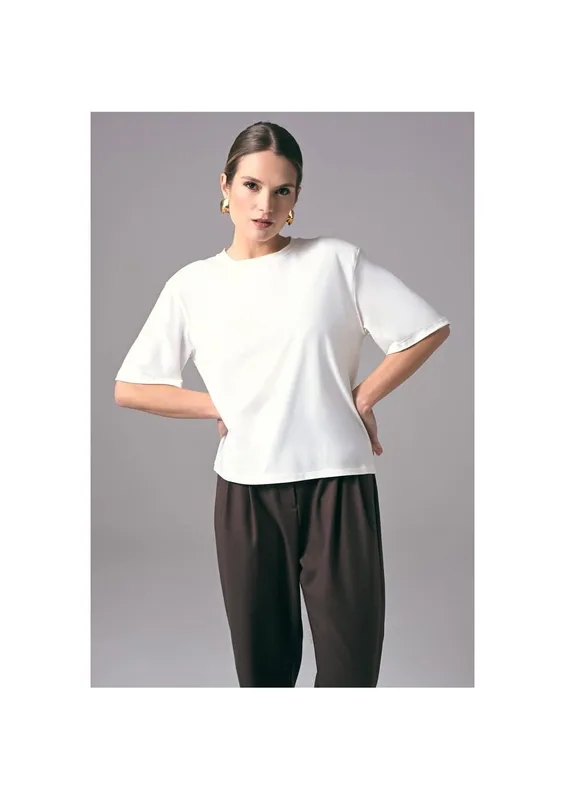 T shirt Power Shoulder – elegancki ecru t shirt damski oversize do pracy