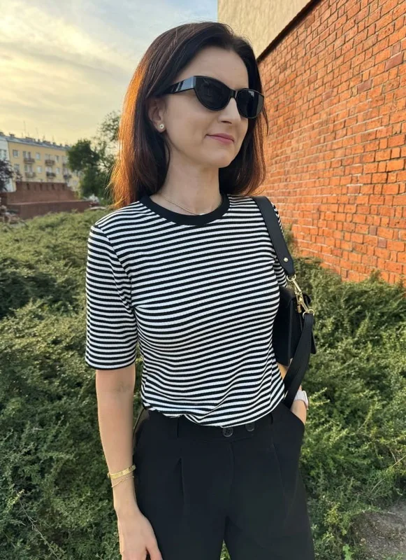 T-shirt OSLO wykonany z prążkowanej wiskozy w wąskie paski w kolorze czarno-białym. Ten model posiada proste rękawy do łokcia oraz klasyczny półokrągły dekolt. Świetny jako element outfitu casual. Modelka ma 173 cm wzrostu i prezentuje rozmiar S/M.