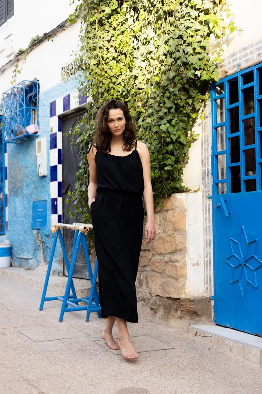 Długa sukienka w czarnym kolorze, wykonana z miękkiej i przewiewnej wiskozy. Po bokach posiada rozcięcia oraz gumkę wszytą w talii. To idealna opcja dla kobiet, które cenią sobie minimalizm i elegancję w swoich stylizacjach. Skład: 100% wiskoza Modelka ma 176 cm wzrostu i ma na sobie rozmiar S/M.