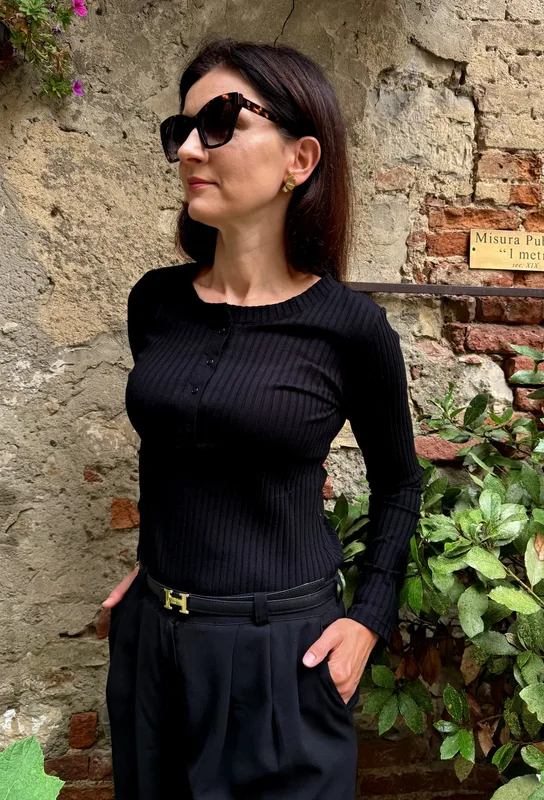 Klasyczna, czarna bluzka z długim rękawem, wykonana z miękkiej, prążkowanej dzianinyi. Subtelny dekolt w kształcie łódki i delikatna listwa z guzikami nadają jej kobiecego charakteru, jednocześnie zachowując minimalistyczny styl. Kolor: czarny Fason: dopasowany Rękaw: długi Dekolt: okrągły z napami Styl: casual, business, minimalistyczny Ta bluzka świetnie sprawdzi się w duecie z eleganckimi spodniami, spódnicą lub jeansami – stwórz własną, ponadczasową stylizację.