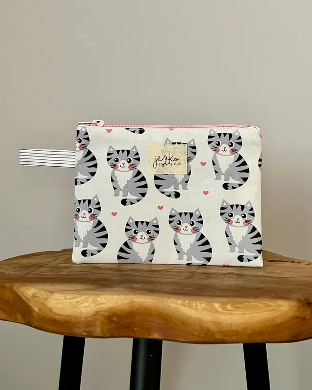 W poprzednim życiu była: poszewką na poduszkę (materiał zewnętrzny – kotki) i koszulą (materiał zewnętrzny – paski i podszewka). Skład: materiał zewnętrzy: 100% bawełna podszewka: 100% bawełna usztywnienie: poliester metka: bawełna zamek: metal, poliester. Wymiary: +/- 19cmx15cm Prać ręcznie lub w pralce w max 30 stopniach, przy użyciu delikatnych środków piorących. Suszyć na płasko, z podszewką na zewnątrz. Nie suszyć w suszarce. Prasować lub parować omijając metkę. Produkt zawiera małe elementy (suwak), występuje ryzyko udławienia. Producent: Jesko Anna Jęśko