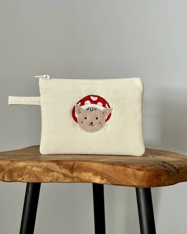 W poprzednim życiu była: obrusem (materiał zewnętrzny), pościelą (podszewka) i skrawkami materiału z drugiej ręki (kotek i muchomor). Skład: materiał zewnętrzy: 100% poliester podszewka: 100% bawełna wypełnienie: poliester metka: poliester zamek: metal, poliester. Wymiary: +/- 18,5cm14cm Pranie delikatne, ręczne, przy użyciu delikatnych środków piorących. Suszyć na płasko, z podszewką na zewnątrz. Nie suszyć w suszarce. Prasować przez bawełnianą ściereczkę. Produkt zawiera małe elementy (suwak), występuje ryzyko udławienia. Producent: Jesko Anna Jęśko