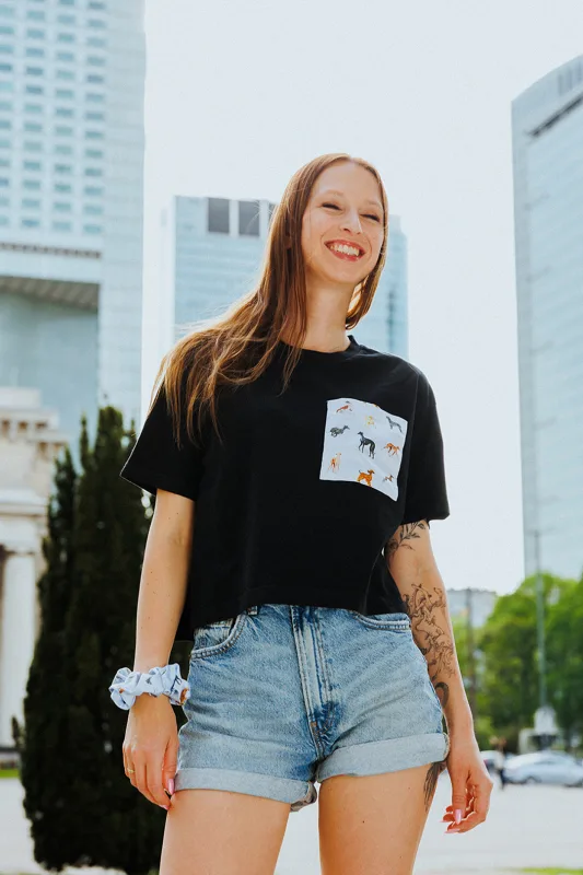 Opis Podkreśl swój styl i miłość do czworonogów dzięki naszemu wyjątkowemu t-shirtowi! Ten czarny, bawełniany t-shirt z subtelną kieszonką zapewnia komfort noszenia przez cały dzień, a jego subtelnie skrócony krój to idealny kompromis pomiędzy klasycznym fasonem, a modnym crop topem – świetnie sprawdzi się w zestawach z wysokim stanem. Charakterystycznym elementem jest kieszonka na piersi z oryginalnym wzorem w ręcznie rysowane sylwetki psów, inspirowanych elegancją chartów. To drobny akcent, który nadaje całości wyjątkowego uroku i przyciąga uwagę. Idealny dla miłośniczek minimalizmu z nutką kreatywności. Czarny T-shirt dostępny jest w dwóch uniwersalnych rozmiarach: S/M oraz L/XL. Dzięki lekko oversize’owemu krojowi zapewnia swobodę i nadaje stylizacji modnego, luźnego charakteru. Sprawdź, jak ten t-shirt pasuje zarówno do codziennych stylizacji, jak i do bardziej wyrazistych looków – uniwersalny, stylowy i pełen charakteru!