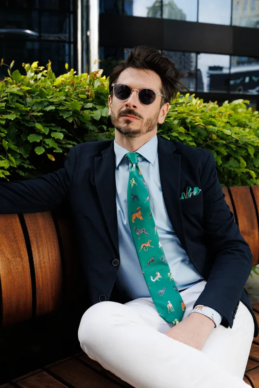 Opis Elegancki krawat męski w kolorze butelkowej zieleni, ze wzorem w charty. To wyjątkowe połączenie klasyki z autorskim wzornictwem. Zachwyca subtelnym połyskiem oraz przyjemnym w dotyku wykończeniem. Charakterystyczny wzór z chartami został ręcznie narysowany i przeniesiony na tkaninę. Krawat został starannie uszyty w Polsce z dbałością o każdy detal. Idealnie sprawdzi się zarówno jako prezent dla miłośnika psów i elegancji, jak i stylowy dodatek na ślub, przyjęcie czy spotkanie biznesowe. Dostępny w czterech kolorach: butelkowa zieleń, granat, błękit i karmel, pozwala dopasować go do wielu stylizacji. Szerokość krawata w najszerszym punkcie: 7,5 cm.