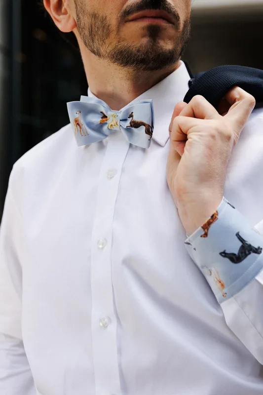 Opis Muszka męska w charty od LOANI to idealna propozycja dla osób ceniących klasyczną elegancję w niebanalnym wydaniu. Błękitna muszka zachwyca lekkością, miękkością i pięknym wzorem przedstawiającym charty – ręcznie rysowane, a następnie przeniesione na tkaninę. Muszka została uszyta w Polsce i posiada regulowane zapięcie, dzięki czemu jest gotowa do założenia od razu po wyjęciu z pudełka. Dostępna w czterech wyrazistych kolorach: butelkowa zieleń, granat, błękit, karmel. Doskonale komponuje się z poszetką z tej samej kolekcji. Każda muszka wykrajana jest ręcznie, z ogromną precyzją, by jak najlepiej wyeksponować sylwetki psów na materiale. Ze względu na niewielką powierzchnię muszki, możliwe jest umieszczenie jedynie trzech sylwetek chartów. Dlatego też rasy prezentowane są w zmiennej, indywidualnej kompozycji, co sprawia, że każdy egzemplarz ma swój unikalny charakter. Zdjęcia pokazują możliwą konfiguracje sylwetek psów, jednak ich wybór jest losowy. Jeśli zależy Ci na uwidocznieniu konkretnej rasy, napisz komentarz do zamówienia lub skontaktuj się z nami, jest szansa, że uda się przesłać Ci muszkę z rasą na której Ci zależy.