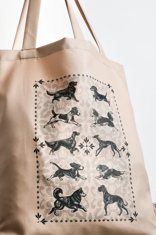 Opis Poznaj naszą nowość! Torba ze wzorem CASA CANINA, która łączy funkcjonalność z powiewem półwyspu Iberyjskiego. Ten wyjątkowy model powstał z miłości do psów, sztuki i detalu. Na froncie torby znajduje się oryginalny wzór przedstawiający 10 sylwetek psów różnych ras, ręcznie rysowanych. Subtelne tło inspirowane portugalskimi kafelkami azulejo przenosi nas do słonecznego południa, dodając kompozycji wyjątkowego charakteru. Wykonana z beżowego, wodoodpornego materiału, torba doskonale sprawdzi się zarówno na zakupy, jak i jako codzienna, stylowa towarzyszka. Wewnątrz znajdziesz kieszonkę zapinaną na zamek – idealną na klucze, telefon czy inne drobiazgi. Wymiary torby: 43 x 37 cm Długość całkowita z uchwytami: ok. 73 cm Wewnętrzna kieszonka na zamek: 20 x 16 cm