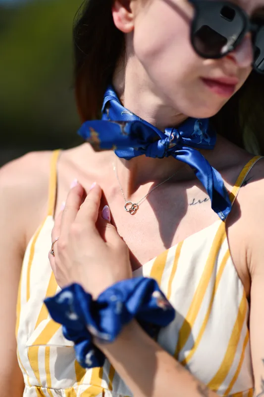 Opis Apaszka satynowa LOANI w odcieniu granatu to elegancki i ponadczasowy dodatek, który doda charakteru każdej stylizacji. Jej wyjątkowość tkwi w autorskim wzorze – całość zdobią ręcznie rysowane charty, przeniesione na tkaninę w duchu sztuki użytkowej. Dzięki temu każda apaszka staje się nie tylko modnym akcesorium, ale także małym dziełem sztuki. Apaszka została wykonana z miękkiej satyny, która pięknie układa się i subtelnie połyskuje. Wymiary 45x45 cm sprawiają, że jest niezwykle łatwa w wiązaniu – możesz ją zawiązać na szyi, nosić jako ozdobę na nadgarstku, dodać do torebki albo wykorzystać jako poszetkę do marynarki. To apaszka o bardzo klasycznych wymiarach. Zaprojektowana i uszyta w Polsce, stanowi idealne połączenie jakości, estetyki i funkcjonalności. To propozycja dla osób, które cenią elegancję z artystycznym akcentem.