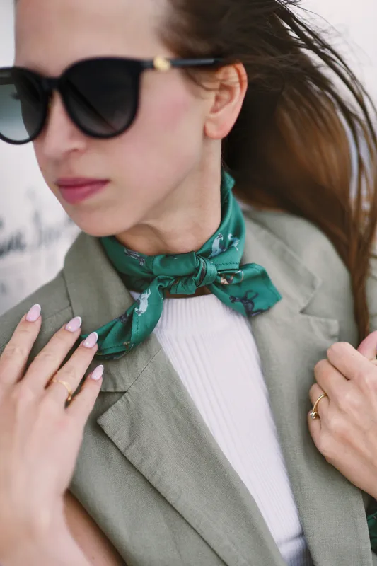Opis Apaszka satynowa LOANI w odcieniu zieleni to elegancki i ponadczasowy dodatek, który doda charakteru każdej stylizacji. Jej wyjątkowość tkwi w autorskim wzorze – całość zdobią ręcznie rysowane charty, przeniesione na tkaninę w duchu sztuki użytkowej. Dzięki temu każda apaszka staje się nie tylko modnym akcesorium, ale także małym dziełem sztuki. Apaszka została wykonana z miękkiej satyny, która pięknie układa się i subtelnie połyskuje. Wymiary 45x45 cm sprawiają, że jest niezwykle łatwa w wiązaniu – możesz ją zawiązać na szyi, nosić jako ozdobę na nadgarstku, dodać do torebki albo wykorzystać jako poszetkę do marynarki. To apaszka o bardzo klasycznych wymiarach. Zaprojektowana i uszyta w Polsce, stanowi idealne połączenie jakości, estetyki i funkcjonalności. To propozycja dla osób, które cenią elegancję z artystycznym akcentem.