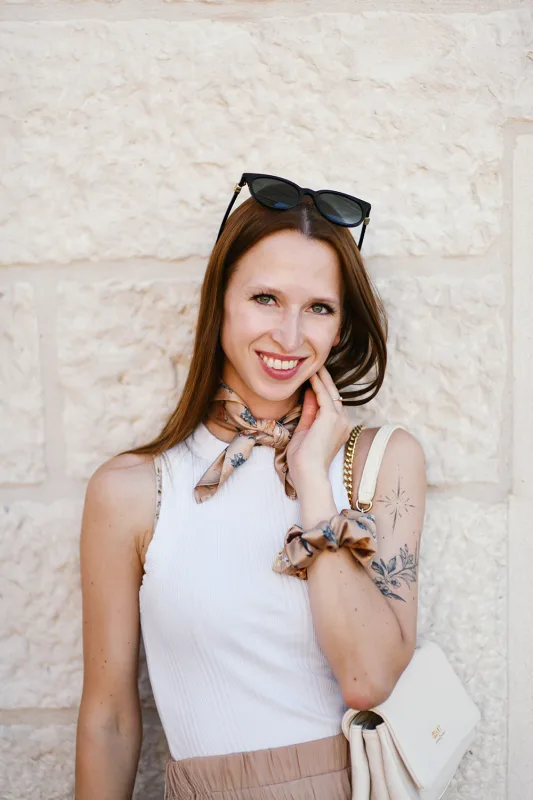 Opis Apaszka satynowa LOANI w odcieniu karmelu to elegancki i ponadczasowy dodatek, który doda charakteru każdej stylizacji. Jej wyjątkowość tkwi w autorskim wzorze – całość zdobią ręcznie rysowane charty, przeniesione na tkaninę w duchu sztuki użytkowej. Dzięki temu każda apaszka staje się nie tylko modnym akcesorium, ale także małym dziełem sztuki. Apaszka została wykonana z miękkiej satyny, która pięknie układa się i subtelnie połyskuje. Wymiary 45x45 cm sprawiają, że jest niezwykle łatwa w wiązaniu – możesz ją zawiązać na szyi, nosić jako ozdobę na nadgarstku, dodać do torebki albo wykorzystać jako poszetkę do marynarki. To apaszka o bardzo klasycznych wymiarach. Zaprojektowana i uszyta w Polsce, stanowi idealne połączenie jakości, estetyki i funkcjonalności. To propozycja dla osób, które cenią elegancję z artystycznym akcentem.