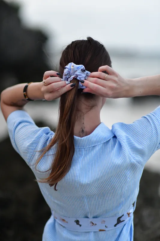Opis Satynowa gumka w charcim wzorze w kolorze błękitu. Wyjątkowo delikatna dla włosów, nie wyrywa ich, nie łamie, a jednocześnie stabilnie utrzymuje fryzurę. Świetnie wygląda również na nadgarstku. Ta ozdobna gumka do włosów w błękitnym kolorze idealnie pasuje jako dodatek do naszych t-shirtów i koszul.