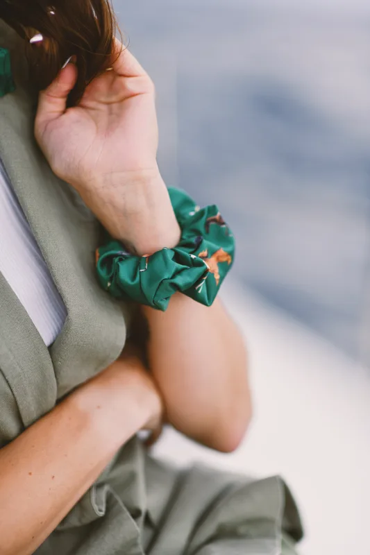 Opis Satynowa gumka w charcim wzorze w kolorze zieleni. Wyjątkowo delikatna dla włosów, nie wyrywa ich, nie łamie, a jednocześnie stabilnie utrzymuje fryzurę. Świetnie wygląda również na nadgarstku. Ta ozdobna gumka do włosów w zielonym kolorze idealnie pasuje jako dodatek do naszych t-shirtów i koszul.