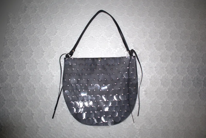 Torba cekinowa czarna szyta przeze mnie z dbałością o każdy detal. Portugalska skóra naturalna bydlęca. Cekiny przymocowane nitami. Zapinana na zatrzask. Zamszowy środek. Wymiary 30 cm x 34 cm. Pasek od nitów do nitów ma 55 cm.