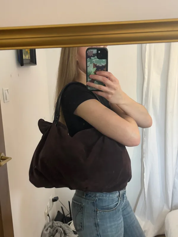 Torba wykonana z włoskiej skóry zamszowej Wymiary 42x38 cm W środku gruba bawełniana podszewka z kieszonką na zamek. Pojedyńczy egzemplarz