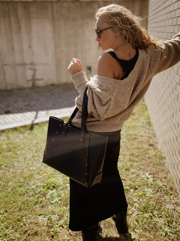 Torebka Shopperka duża, kolekcja „Katowice", kolor czarny, skóra naturalna Nieszablonowa wersja popularnej damskiej torebki typu Shopper bag lub siostrzanej wersji Tote Bag. To połączenie klasycznej formy z artystyczną rzemieślniczą kreacją. Prosty krój z charakterystycznie wystającymi brzegami, w surowym stylu, wykończony jest nitami, które nadają jej „ostrego" charakteru. Gruba skóra, z której została uszyta sprawia, że torebka jednocześnie wygląda bardzo elegancko. W środku znajduje się wewnętrzna, skórzana kieszonka, do której swobodnie schowasz telefon, pomadkę, kluczyki i inne drobne przedmioty. Shopperka NALA swobodnie mieści format A4, jest bardzo pakowna jednocześnie wygodna i poręczna. Precyzyjnie dobrana długość solidnych uszek, umożliwia swobodne noszenie je na ramieniu i trzymanie w dłoni. Torebka zamykana jest od wewnątrz na guziki typu napa. Opis produktu: Wymiary torebki: długość: 39 cm (podstawa) - 46 cm (na górze) x wysokość: (głębokość) 27 cm x szerokość: (boki) 11-20 cm Długość pasków: 58 cm Waga: 1,2 kg Materiał: skóra naturalna garbowana roślinnie Grubość skóry: 1,8 mm Kolor: czarny Szew: kolor czarny Okucia: napy, nity kolor stare złoto Wnętrze torebki: wykończona mizdra, brak podszewki, wewnętrzna kiszonka ze skóry naturalnej Wymiary wewnętrznej kieszonki: wysokość: 12,5 cm x długość: 17,5 cm Zapinanie: 2 guziki typu napa Pielęgnacja i czyszczenie: Wszelkie informacje znajdziesz w zakładce "pielęgnacja i czyszczenie" -> KLIK