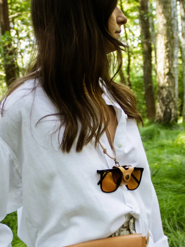 Klips na okulary, na rzemyku, kolekcja „Łeba", kolor piaskowy, skóra naturalna Mały i przydatny gadżet, który jest jak wisienka na torcie dla każdej letniej stylizacji. Od teraz będziesz mieć swoje okulary przeciwsłoneczne zawsze w zasięgu ręki. Klips zawieszony jest na regulowanym, skórzanym rzemyku, byś mogła nosić go jak biżuterię na szyi. Pięknie wygląda również odwieszony do paska torebki na breloczku mocującym NALA. *W przypadku odcienia piaskowego, który jest kolorem naturalnym bez dodatku pigmentu barwa produktu wraz z upływem czasu i działania czynników zewnętrznych (w szczególności promieni słonecznych) zmienia się - ciemniejąc. Jest to proces naturalny charakterystyczny dla skór garbowanych roślinne, najbardziej szlachetnych i trwałych. Zmiana odcienia skóry nie jest podstawą reklamacji, bowiem świadczy o jej najwyższej jakości. Kolor ten w procesie ciemnienia nabiera głębokiej barwy, której nie da się odtworzyć używając żadnego barwnika. Jesteśmy przekonane, że ten proces Was zachwyci i tak jak my pokochacie jasną skórę za jej wyjątkowe właściwości. Opis produktu: Wymiary zapiętego klipsa: 2,5 cm x 4 cm System mocowania: oczka, karabińczyk na rzemyku Materiał: skóra naturalna garbowana roślinnie Grubość skóry: 1,8 mm Kolor: piaskowy Okucia: napa, oczka, kolor stare złoto Pielęgnacja i czyszczenie: Wszelkie informacje znajdziesz w zakładce "pielęgnacja i czyszczenie" -> KLIK