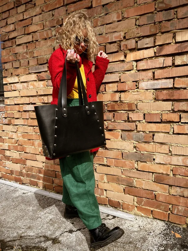 Torebka Shopperka duża, kolekcja „Katowice", kolor czarny, wykończenia srebrne, skóra naturalna Nieszablonowa wersja popularnej damskiej torebki typu Shopper bag lub siostrzanej wersji Tote Bag. To połączenie klasycznej formy z artystyczną rzemieślniczą kreacją. Prosty krój z charakterystycznie wystającymi brzegami, w surowym stylu, wykończony jest nitami, które nadają jej „ostrego" charakteru. Gruba skóra, z której została uszyta sprawia, że torebka jednocześnie wygląda bardzo elegancko. W środku znajduje się wewnętrzna, skórzana kieszonka, do której swobodnie schowasz telefon, pomadkę, kluczyki i inne drobne przedmioty. Shopperka NALA swobodnie mieści format A4, jest bardzo pakowna jednocześnie wygodna i poręczna. Precyzyjnie dobrana długość solidnych uszek, umożliwia swobodne noszenie je na ramieniu i trzymanie w dłoni. Torebka zamykana jest od wewnątrz na guziki typu napa. Opis produktu: Wymiary torebki: długość: 39 cm (podstawa) - 46 cm (na górze) x wysokość: (głębokość) 27 cm x szerokość: (boki) 11-20 cm Długość pasków: 58 cm Waga: 1,2 kg Materiał: skóra naturalna garbowana roślinnie Grubość skóry: 1,8 mm Kolor: czarny Szew: kolor czarny Okucia: napy, nity kolor srebro Wnętrze torebki: wykończona mizdra, brak podszewki, wewnętrzna kiszonka ze skóry naturalnej Wymiary wewnętrznej kieszonki: wysokość: 12,5 cm x długość: 17,5 cm Zapinanie: 2 guziki typu napa Pielęgnacja i czyszczenie: Wszelkie informacje znajdziesz w zakładce "pielęgnacja i czyszczenie" -> KLIK
