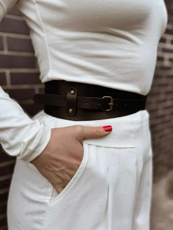 Pasek zapinany, kolekcja „Katowice", skóra naturalna, kolor czarny, okucia stare złoto P asek NALA zapinany na dwie, symetrycznie ustawione po bokach, klamry doskonale podkresla talie, nadając Twojej figurze proporcji i podkreslajac jej kobiecy ksztalt. Składa się z szerokiej części otaczającej talię oraz węższego paska służącego do regulacji. Doskonale sprawdzi się zarówno do sukienki, koszuli, bluzki, a nawet grubszego swetra, komponując się z różnymi stylami. Ten pasek to nie tylko funkcjonalny element garderoby, ale również wyrafinowany detal, który dodaje charakteru każdej kreacji. Opis produktu: Wymiary: ROZMIAR S/M: obwód w pasie od 65 cm do 80 cm ROZMIAR L/XL: obwód w pasie od 80 cm do 94 cm System regulacji: klamry Materiał: skóra naturalna garbowana roślinnie Grubość skóry: 1,4 mm Kolor: czarny Okucia: napy, nity kolor stare złoto Pielęgnacja i czyszczenie: Wszelkie informacje znajdziesz w zakładce "pielęgnacja i czyszczenie" -> KLIK