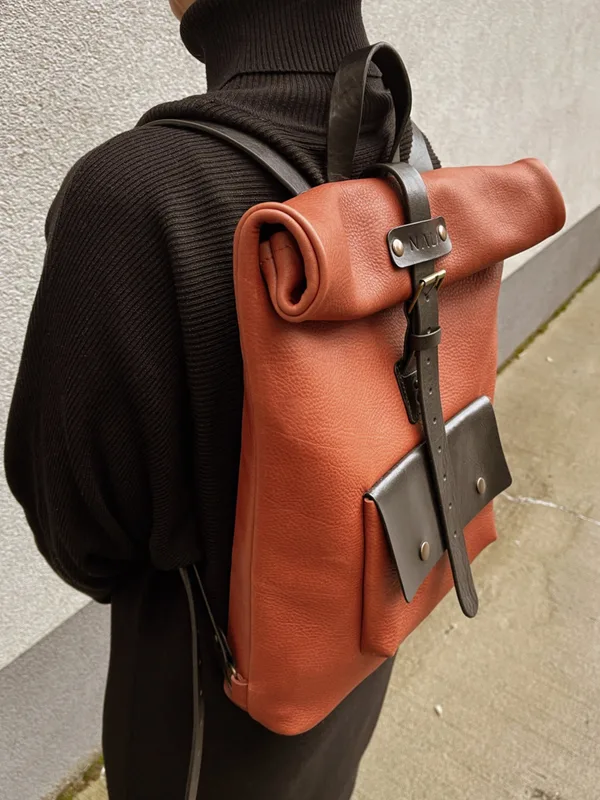 Plecak Kurierski rudo - czarny, skóra naturalna Pojemny, praktyczny, wygodny, nietuzinkowy i piękny - taki jest plecak kurierski NALA. Solidne wykonanie i najlepsza skóra są gwarancją, że to produkt, który zostanie z Tobą przez długie lata. S woją unikatowość zawdzięcza połączeniu dwóch rodzajów skóry o różnorodnej fakturze i kolorystyce. Ten subtelny kontrast sprawia, że plecak zyskuje wyjątkową estetykę. Korpus wykonany jest z delikatnej, a zarazem wytrzymałej i mięsistej skóry, pozostałe elementy, jak paski i klapa kieszeni, są zrobione z grubej licowej skóry, nadając całości solidny i elegancki wygląd. Plecak swobodnie mieści format A4, posiada wewnątrz skórzaną przegrodę na laptopa, która zabiezbiecza go i jednocześnie usztywnia całą konstrukcje. Możliwość regulowania wyokości plecaka czyni go niezwykle pakownym. To produkt, który łączy nowoczesność z tradycją - stworzony dla osób ceniących oryginalność i trwałość, jednocześnie idealny do codziennego użytku, emanuje rzemieśliniczym charakterem, który przykuwa uwagę i wyróżnia z tłumu. Opis produktu: Wymiary plecaka : wysokość: 41 cm x 38 cm x 8 cm Mieści format A4 / Laptop 15 cali Kieszeń zewnętrzna: 22 cm x 14 cm Szelki regulowane Waga: 1,4 kg Materiał: skóra naturalna garbowana roślinnie Grubość skóry: 2 mm Kolor: rudy + czarny Szew: kolor rudy Okucia: napy, nity kolor stare złoto Wnętrze torebki: zamsz, wewnętrzna skórzana przegroda na laptopa Zapinanie: klamra na regulowanym pasku , 2 guziki typu napa Pielęgnacja i czyszczenie: Wszelkie informacje znajdziesz w zakładce "pielęgnacja i czyszczenie" -> KLIK