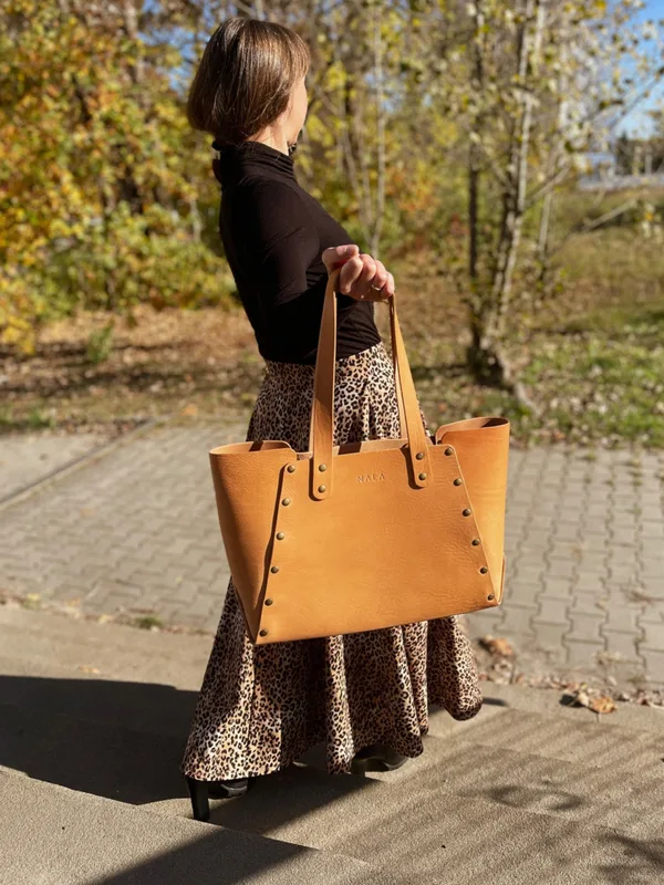 Torebka Shopperka duża, kolekcja „Łeba", kolor piaskowy, skóra naturalna Nieszablonowa wersja popularnej damskiej torebki typu Shopper bag lub siostrzanej wersji Tote Bag. To połączenie klasycznej formy z artystyczną rzemieślniczą kreacją. Prosty krój z charakterystycznie wystającymi brzegami, w surowym stylu, wykończony jest nitami, które nadają jej „ostrego" charakteru. Gruba skóra, z której została uszyta sprawia, że torebka jednocześnie wygląda bardzo elegancko. W środku znajduje się wewnętrzna, skórzana kieszonka, do której swobodnie schowasz telefon, pomadkę, kluczyki i inne drobne przedmioty. Shopperka NALA swobodnie mieści format A4, jest bardzo pakowna jednocześnie wygodna i poręczna. Precyzyjnie dobrana długość solidnych uszek, umożliwia swobodne noszenie je na ramieniu i trzymanie w dłoni. Torebka zamykana jest od wewnątrz na guziki typu napa. *W przypadku odcienia piaskowego, który jest kolorem naturalnym bez dodatku pigmentu barwa produktu wraz z upływem czasu i działania czynników zewnętrznych (w szczególności promieni słonecznych) zmienia się - ciemniejąc. Jest to proces naturalny charakterystyczny dla skór garbowanych roślinne, najbardziej szlachetnych i trwałych. Zmiana odcienia skóry nie jest podstawą reklamacji, bowiem świadczy o jej najwyższej jakości. Kolor ten w procesie ciemnienia nabiera głębokiej barwy, której nie da się odtworzyć używając żadnego barwnika. Jesteśmy przekonane, że ten proces Was zachwyci i tak jak my pokochacie jasną skórę za jej wyjątkowe właściwości. Opis produktu: Wymiary torebki: długość: 39 cm (podstawa) - 46 cm (na górze) x wysokość: (głębokość) 27 cm x szerokość: (boki) 11-20 cm Długość pasków: 58 cm Waga: 1,2 kg Materiał: skóra naturalna garbowana roślinnie Grubość skóry: 1,8 mm Kolor: czarny Szew: karmelowy brąz Okucia: napy, nity kolor stare złoto Wnętrze torebki: wykończona mizdra, brak podszewki, wewnętrzna kiszonka ze skóry naturalnej Wymiary wewnętrznej kieszonki: wysokość: 12,5 cm x długość: 17,5 cm Zapinanie: 2 guziki typu napa Pielęgnacja i czyszczenie: Wszelkie informacje znajdziesz w zakładce "pielęgnacja i czyszczenie" -> KLIK