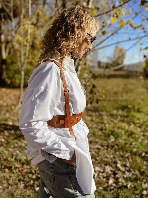 Szelki typu Hernes, kolekcja "Szczyrk", skóra naturalna, kolor kasztanowy, okucia złote Nasze damskie szelki typu Hernes to połączenie elegancji, kobiecości i zmysłowego wyrafinowania. Regulowana szerokość w pasie zapewnia idealne dopasowanie w talii, podkreślając kobiecą figurę (do wyboru - dwa rozmiary). Szeroki zakres regulacji pasów na ramionach pozwala dopasować długość do każdego wzrostu. Ten seksowny dodatek doskonale komponuje się zarówno z elegancką koszulą, jak i prostą bluzką, dodając każdej stylizacji niepowtarzalnego charakteru. Wykończone srebrnymi nitami, szelki emanują rockowym stylem, co sprawia, że są idealnym uzupełnieniem dla kobiet poszukujących oryginalnych i stylowych akcentów do swojej garderoby. Opis produktu: Wymiary: ROZMIAR S/M: obwód w pasie od 65 cm do 80 cm ROZMIAR L/XL: obwód w pasie od 80 cm do 94 cm System regulacji: klamry Materiał: skóra naturalna garbowana roślinnie Grubość skóry: 1,4 mm Kolor: kasztanowy Okucia: napy, nity kolor stare złoto Pielęgnacja i czyszczenie: Wszelkie informacje znajdziesz w zakładce "pielęgnacja i czyszczenie" -> KLIK