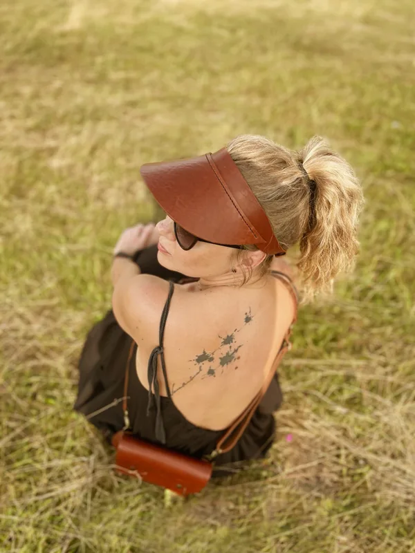 Daszek przeciwsłoneczny mały, kolekcja „Szczyrk", kolor kasztanowy, skóra naturalna Ten daszek łączy lekki sportowy styl z miejskim szykiem i elegancją. Ten letni gadżet nie tylko ochroni Cię przed słońcem, ale będzie unikatowym dopełnieniem Twoich letnich stylizacji. Łącz go z innymi skórzanymi produktami NALA i olśniewaj! Postaw na oryginalność i zaskocz wszystkich niebanalnym wizerunkiem. Opis produktu: Obwód daszka: 52 cm do 60 cm Szerokość daszka: 10 cm Regulacja: 6 guzików typu napa Materiał: skóra naturalna garbowana roślinnie Grubość skóry: 3,5 mm Kolor daszka: kasztanowy brąz Szew: lniana nić, kolor czarny Okucia: napy, kolor stare złoto Pielęgnacja i czyszczenie: Wszelkie informacje znajdziesz w zakładce "pielęgnacja i czyszczenie" -> KLIK