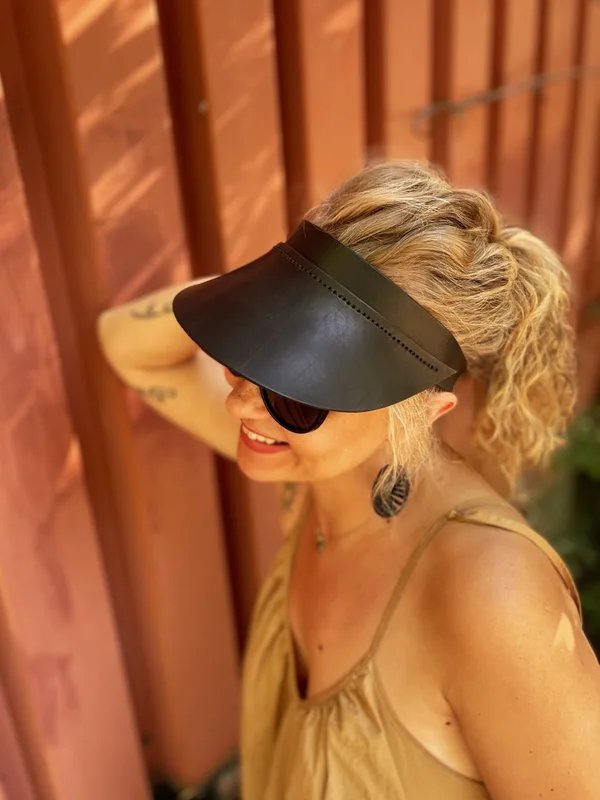 Daszek przeciwsłoneczny mały, kolekcja „Katowice”, kolor czarny, skóra naturalna Ten daszek łączy lekki sportowy styl z miejskim szykiem i elegancją. Ten letni gadżet nie tylko ochroni Cię przed słońcem, ale będzie unikatowym dopełnieniem Twoich letnich stylizacji. Łącz go z innymi skórzanymi produktami NALA i olśniewaj! Postaw na oryginalność i zaskocz wszystkich niebanalnym wizerunkiem. Opis produktu: Obwód daszka: 52 cm do 60 cm Szerokość daszka: 10 cm Regulacja: 6 guzików typu napa Materiał: skóra naturalna garbowana roślinnie Grubość skóry: 3,5 mm Kolor daszka: czarny Szew: lniana nić, kolor czarny Okucia: napy, kolor stare złoto Pielęgnacja i czyszczenie: Wszelkie informacje znajdziesz w zakładce "pielęgnacja i czyszczenie" -> KLIK