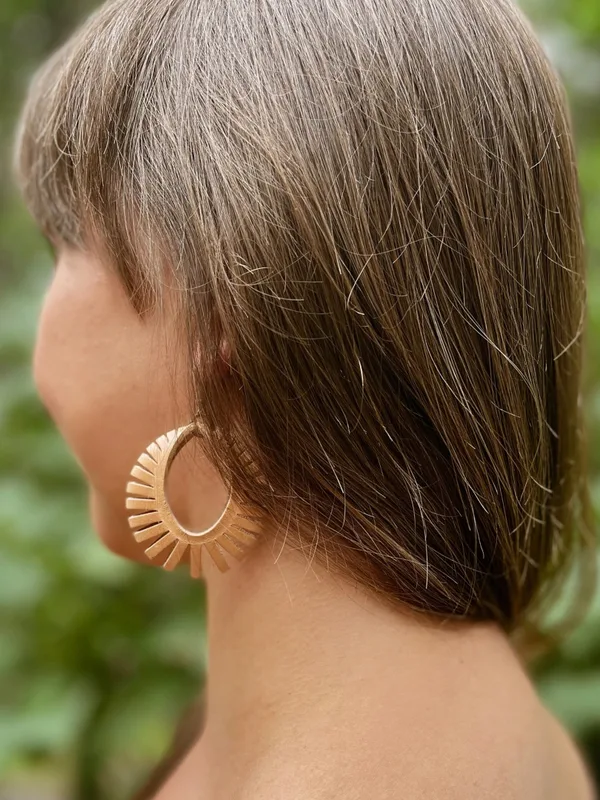 Kolczyki "Promienie", kolekcja "Łeba", kolor piaskowy, skóra naturalna Kolczyki "Promienie" to elegancki, niebanalny a zarazem subtelny dodatek biżuteryjny, który będzie doskonałym zwieńczeniem każdej stylizacji. Świetnie sprawdzą się zarówno do kreacji w stylu boho, etno i vitage jak również do strojów casualowych, klasycznych a nawet biznesowych. Sprawdź jak fantastycznie wyglądają jako pojedynczy, skórzany dodatek lub w zestawie z np. bransoletką NALA. *W przypadku odcienia piaskowego, który jest kolorem naturalnym bez dodatku pigmentu barwa produktu wraz z upływem czasu i działania czynników zewnętrznych (w szczególności promieni słonecznych) zmienia się - ciemniejąc. Jest to proces naturalny charakterystyczny dla skór garbowanych roślinne, najbardziej szlachetnych i trwałych. Zmiana odcienia skóry nie jest podstawą reklamacji, bowiem świadczy o jej najwyższej jakości. Kolor ten w procesie ciemnienia nabiera głębokiej barwy, której nie da się odtworzyć używając żadnego barwnika. Jesteśmy przekonane, że ten proces Was zachwyci i tak jak my pokochacie jasną skórę za jej wyjątkowe właściwości. Opis produktu: Wymiary: średnica zewntrzna : 5cm System mocowania: bigle metalowe Materiał: skóra naturalna garbowana roślinnie Grubość skóry: 1,8 mm Kolor : piaskowy Szew: brak Okucia: bigle, kóła łączeniowe, kolor stare złoto Pielęgnacja i czyszczenie: Wszelkie informacje znajdziesz w zakładce "pielęgnacja i czyszczenie" -> KLIK