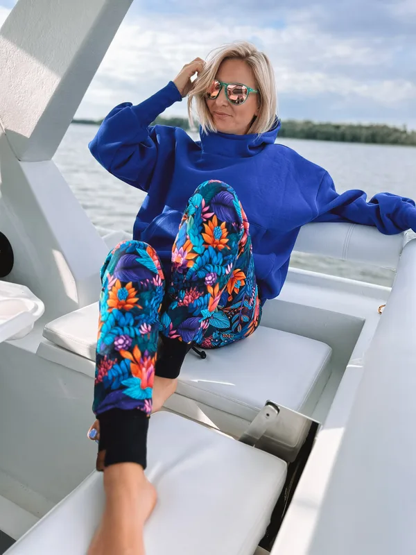 Spodnie dresowe wzorzyste. Klasyczne spodnie z regularnym stanem, z dwoma kieszeniami, ściągacze przy nogawkach, na gumie w pasie, regulowane sznurkiem. Wyjątkowe wzory do wyboru. Nogawki lekko zwężane, krój klasyczny. Wisienka na torcie: dopasujemy je do Twojego wzrostu! Uszyte z dresówki z elastanem w wyjątkowych wzorach do wyboru. Rozmiarówka pełna. Dopasowujemy do wzrostu! a to świetna wiadomość dla wysokich i niskich. Z jakiego materiału je dla Ciebie uszyjemy? Dzianiny wyprodukowane z najwyższej jakości przędzy bawełnianej. Dzianina niewyczuwalnym w dotyku nadrukiem cyfrowym, charakteryzującym się niezwykłą trwałością, intensywnością kolorów. Dzianina została poddana procesowi dodatkowego zmiękczania, co czyni ją niezwykle miękką w dotyku. Skład: Bawełna 95%, Elastan 5% Gramatura: 240g/m2 Wolisz dobrać rozmiar porównując do innych Twoich spodni? Nie ma problemu! Poniżej szerokość w pasie / obwód gumy / obwód na wysokości uda / obwód na wysokości kostki dla: Spodnie dresowe wzorzyste XS 40cm/62/53/31 S 42cm/64/56/32 M 43cm/68/59/33 L 45cm/74/61/34 XL 48cm/80/64/35 XXL 49cm /86/67/36 Na zdjęciu modelka Patrycja ma spodnie w rozmiarze M wzór: tropikalny ogród i Dużą Bluzę Mojego faceta w kolorze chabrowym. Jak nosić wzorzyste ubrania? Jak łączyć wzory? Sprawdź! – Portal dla Kobiet – blogkobiet.pl
