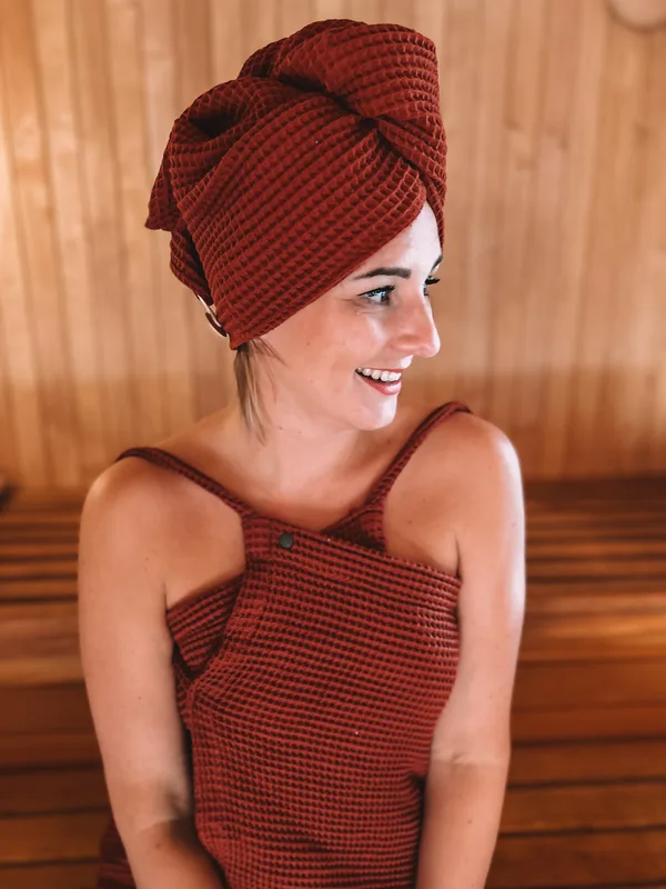 Turban wafelek to dodatek, który idealnie nadaje się nie tylko do sauny czy na basen, jest bardzo praktyczny przy zabiegach pielęgnacyjnych. Turbany szyjemy z waflowanej bawełny 100% dzięki czemu jest naturalny, chłonny i trwały. Rozmiar uniwersalny. Klasyczny ręcznik jest ciężki i spada z mokrych włosów, turban jest bardzo praktyczny szczególnie podczas rytuałów pielęgnacyjnych, makijażu, ubierania się, włosy nie spadają na twarz, stabilnie się utrzymując w miękkim bawełnianym ręczniku. Co daje turban w saunie? Zalety stosowania ochrony głowy: 1. Zapobieganie przegrzaniu organizmu Przegrzanie skóry głowy podczas saunowania może skutkować zawrotami głowy lub nawet omdleniami, co może mieć swoje dodatkowe nieprzyjemne zdrowotne konsekwencje. 2. Ochrona włosów Wiele kobiet na co dzień zwraca szczególną uwagę na pielęgnację włosów – to właśnie te Panie powinny zaopatrzyć się w turban do sauny, by gorące powietrze nie przesuszyło ich włosów. 3. Wygoda Klasyczny ręcznik jest ciężki i spada z mokrych włosów, turban jest bardzo praktyczny – kilkoma ruchami skręcasz turban i mocujesz końcówkę na guzik z tyłu. Idealnie pasuje w komplecie z Ręcznik – sukienka do sauny – No Pewnie