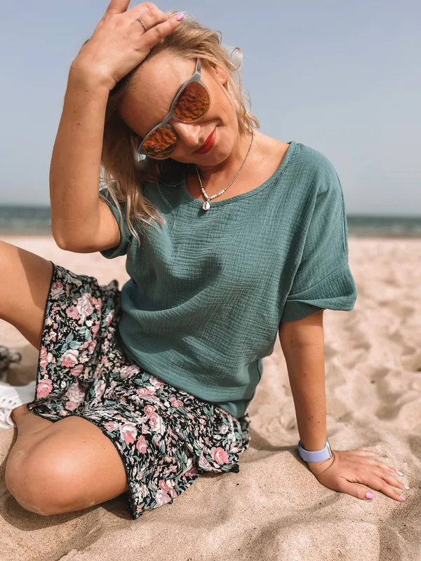 Najlepszy T-shirt na świecie! Uszyty tym razem z muślinu, wygodny w noszeniu i pielęgnacji. Krój z lekkim luzem, wywijane rękawy i dokładne wykończenie. Pęknięcie na plecach z guziczkiem. Bluzkę szyjemy w trzech rozmiarach. Nie sugeruj się numeracją tylko pomiarami. Możliwe, że wolisz bardziej dopasowany krój i wtedy nawet najmniejszy rozmiar będzie ok. Rozmiary :(mierzona bluzka) XS/S szerokość pod pachami 48cm, S/M szerokość pod pachami 52cm, L szerokość pod pachami 57cm. Potrzebny większy? Wybierz niestandardowy i wpisz w uwagach do zamówienia wymiary. Bluzki możemy dopasować do wzrostu – Możemy też uszyć każdą długość (max66cm) Muślinowa bluzka Muślin – to co wszystkie lubimy nosić latem! materiał: 100% bawełna faktura materiału: chropowata – muślin Skład: Bawełna 100% Gramatura: ok. 125g/m2 Modelka na zdjęciu ma na sobie rozmiar S/M kolor szałwiowy. Składając zamówienie nie kupujesz gotowego produktu – szyjemy go specjalnie dla Ciebie. Składając zamówienie akceptujesz regulamin sklepu.