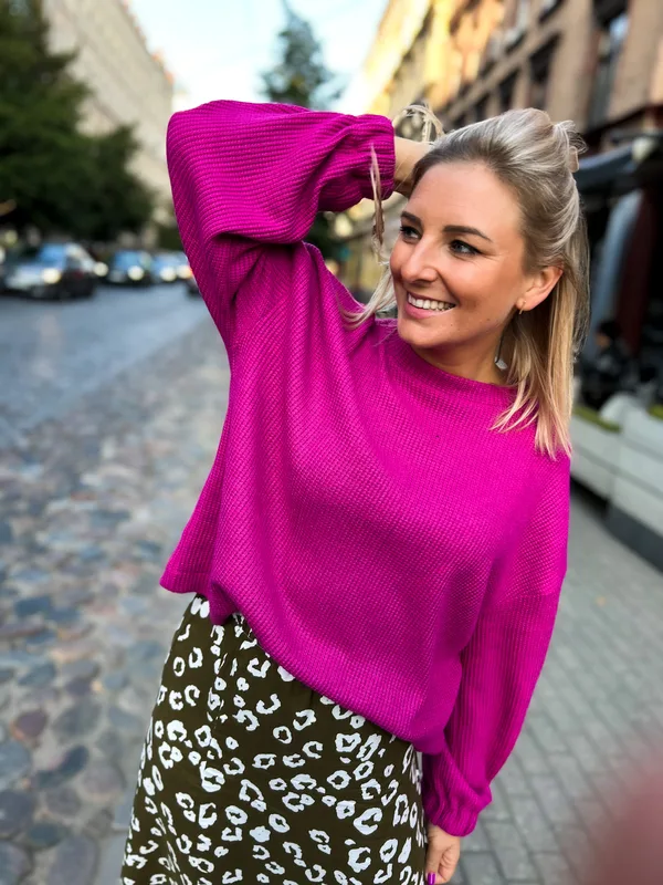 Sweter Ryga! Sweter z szerokimi, bufiastymi rękawami, wykonany z materiału o wyraźnym splocie, co nadaje mu modny, casualowy charakter. Sweter jest luźny, co sprawia, że całość wygląda swobodnie i komfortowo. Rękawy zebrane na nadgarstkach gumką, na dole sweter luźny. Mały dekolt. Skład: 50% wiskoza; 25% tencel; 25% nylon Wyróżnia się kilkoma istotnymi cechami: 1. *Kolor* : Intensywny różowy odcień swetra przyciąga wzrok i nadaje energii całej stylizacji. Taki kolor często kojarzy się z radością i świeżością. Możesz wybrać dowolny kolor. Poniżej zamieszczamy wszystkie dostępne kolorze (kliknij w obrazek KOLORY) 2. *Materiał* : Sweter wykonany jest z lekkiego, przewiewnego materiału, co sprawia, że jest idealny na przejściowe pory roku. Widoczny splot dodaje mu tekstury i charakteru. Materiał jest wyjątkowo miękki, delikatny i przyjemny w dotyku. Oferowana dzianina wykonana została z wysokiej jakości grubej przędzy. Struktura materiału typowa dla dzianin swetrowych jest doskonale widoczna z dwóch stron. Ponadto, materiał rozciąga się we wszystkich kierunkach. Tencel jako nowoczesne włókno zapewnia wysoki komfort użytkowania – dzianina z jego dodatkiem sprawdza się zarówno podczas zimnych jak i ciepłych temperatur. Jest również przyjazny dla środowiska ze względu na całkowitą biodegradowalność. Tencel i nylon sprawiają także, że dzianina mniej się gniecie i jest bardziej wytrzymała. 3. *Krój* : Luźny krój swetra sprawia, że jest on bardzo komfortowy w noszeniu. Szerokie rękawy o bufiastym kształcie nadają mu modny i kobiecy look, a także zapewniają większą swobodę ruchów. 4. *Długość* : Sweter ma dłuższy krój, co starannie balansuje z dopasowaną spódnicą, tworząc proporcjonalną sylwetkę. Taki fason sprawia, że świetnie nadaje się do noszenia z różnymi elementami garderoby, zarówno z spódnicami, jak i spodniami. 5. *Styl* : Sweter ma casualowy charakter, idealny do codziennych stylizacji. Można go łatwo zestawiać z różnorodnymi dodatkami, co sprawia, że jest bardzo uniwersalny. 6. *Wykończenie* : Sweter ma ściągające ale nie uciskające gumki na mankietach, co dodaje im jeszcze więcej stylu oraz pozwala na regulację długości rękawów. Ten różowy sweter to przykład modnego i wygodnego elementu garderoby, który może być bazą dla wielu różnych stylizacji, od casualowych po bardziej eleganckie. Wymiary gotowego swetra standard: XS szerokość: 56cm długość: 58cm S/M szerokość: 60cm długość: 60cm L/XL szerokość: 64cm długość: 62cm UWAGA: te wymiary możesz zmienić – dopisz w uwagach jakie ma mieć wymiary i takie uszyjemy, jeśli wpiszesz swój wzrost dopasujemy długość rękawów i swetra do Twoich potrzeb.