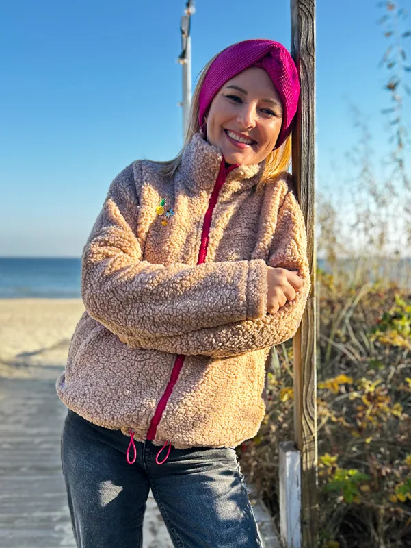 Bluza baranek – najcieplejsza bluza w naszej ofercie. Jak zbudowana? szeroki krój z opuszczoną linią ramion dół wykończony gumeczką w kolorze intensywnego różu – można ściągacz aby uzyskać efekt bomberki rękawy zwężane do nadgarstka dwuwarstwowa – cieplutka! ciepła stójka dwie głębokie kieszenie na przodzie bluzy Z czego uszyjemy Twoją bluzę? Na zewnątrz: Materiał o strukturze baranka miękki w dotyku i plastyczny. Gramatura 600g/m2 (ciepły!!!) Skład: 100% poliester Do wyboru kolory: beż ciepły (jak na zdjęciach gotowego produktu – aktualnie niedostępny) i czarny, zielony, kakao, chabrowy, fuksja, latte, pastelowy róż W środku: kolorowa pantera Silk Indo Twil: jest lekką, nowoczesną tkaniną wyprodukowaną w 98% z wysokiej jakości poliestru oraz 2% spandexu. Tkanina nie gniecie się. Dodatkowo jest niesamowicie delikatna i przyjemna w dotyku oraz przewiewna. Możesz zmienić poliestrową podszewkę na taką z wiskozy – będzie cieńsza, ale nadal przyjemna – daj nam znać o zmianie w wiadomości do zamówienia. Dodatki? Bluza jest wykończona kolorem intensywnego różu (fuksja) – zamek i gumeczki. Do każdego wybranego koloru bluzy pasują idealnie 🙂 Dodatkowo – aby była zupełnie wyjątkowa dodajemy trzy przypinki, które będą dla Ciebie niespodzianką. Dlaczego pytamy Cię o wzrost? Żebyśmy odpowiednio mogły dopasować długość bluzy i rękawów. Jeśli nie podasz – bluza będzie standardowo miała długość 60cm