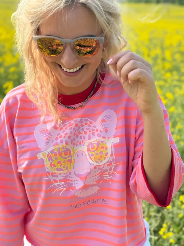 T-shirt „Pantera z Fantazją” – różowo i z pazurem! Przywitaj lato z uśmiechem (i stylem!) w naszym wyjątkowym t-shircie „Pantera z Fantazją” ! Ten zwariowany model to idealne połączenie luzu, koloru i humoru. Uszyty z cienkiej dresówki bawełnianej, otuli Cię miękkością i przewiewnością – niezależnie od tego, czy łapiesz słońce na łące, czy biegniesz po kawę. Koszulka w różowo-pomarańczowe paski zdobiona jest nadrukiem stylowej pantery w okularkach, która mówi: „NO PEWNIE!”. Lamówka w kolorze czerwonym i dół wykończony na surowo. Czy to manifest życiowego luzu? A może po prostu Twój nowy stylowy towarzysz? Oceń sama! Dlaczego ją pokochasz? ✔️ Uszyta z miękkiej, cienkiej dresówki bawełnianej – komfort gwarantowany! ✔️ Oversize’owy krój i rękawy ¾ – luz i swoboda w każdej sytuacji ✔️ Soczyste kolory i zabawny nadruk – bo moda może (i powinna) bawić! ✔️ Idealna na lato, wakacje, festiwale i… każdy dzień, kiedy chcesz się wyróżnić Dostępne rozmiary: XS/S szerokość 55cm M/L szerokość 59cm L/XL szerokość 63cm Długość standard: 50cm Skład: 95% bawełna, 5% elastan Made with 💛 in Poland Załóż „Panterę z Fantazją” i pokaż światu, że dystans do siebie to Twój największy atut! 🐆😎 Modelka na zdjęciu ma na sobie rozmiar M/L