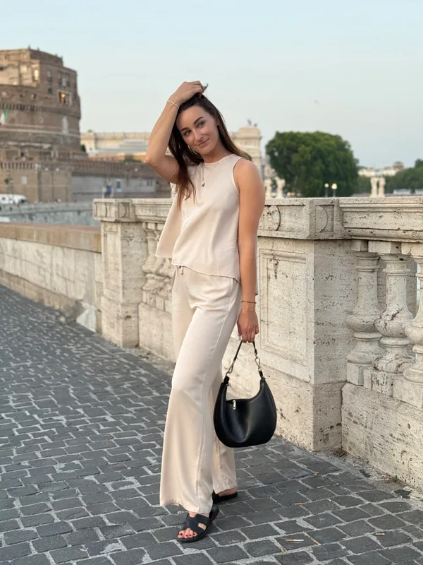 Spodnie twill łagodne Spodnie uszyte z wiskozy twill, co sprawia, że są super miękkie i wygodne. Wiskoza jest znana z tego, że jest miękka i przyjemna w dotyku, co sprawia, że odzież wykonana z tego materiału jest komfortowa do noszenia. Splot twill w wiskozie tworzy diagonalny wzór, co dodaje tkaninie lekkości i elegancji. Taki splot sprawia, że materiał jest bardziej trwały i odporny na zniszczenia. Wiskoza ma naturalne właściwości odprowadzające wilgoć, co sprawia, że materiał jest przewiewny i odpowiedni na cieplejsze dni. Materiał ten jest mniej podatny na gniecenie w porównaniu do tradycyjnej wiskozy, co sprawia, że odzież z wiskozy twill wygląda schludnie przez dłuższy czas. Występują w różnych kolorach, więc każda z nas znajdzie coś dla siebie! Mają szerokie nogawki, które nie tylko wyglądają stylowo, ale też zapewniają swobodę ruchów. Najmodniejszy w tym sezonie krój. Dzięki kieszeniom możesz mieć pod ręką wszystkie swoje drobiazgi. Do tego elastyczny troczek w pasie pozwala na idealne dopasowanie, co jest mega wygodne. Pomysły na stylizacje: 1. Casual Look – Góra: Dopasowany T-shirt lub top w jednolitym kolorze. – Obuwie: Sneakersy lub espadryle. – Akcesoria: Plecak lub torba typu shopper, delikatne naszyjniki. 2. Elegancka Stylizacja – Góra: Bluzka lub koszula z lekkiego materiału, z dekoltem w serek lub w fasonie oversize. – Obuwie: Sandały na obcasie lub baleriny. – Akcesoria: Klasyczna torebka, eleganckie kolczyki i bransoletka. 3. Styl Boho – Góra: Zwiewna bluzka z koronkowymi detalami lub oversize’owy sweter. – Obuwie: Sandały z frędzlami lub botki. – Akcesoria: Duże kolczyki, kapelusz i torba na ramie z naturalnych materiałów. 4. Sportowy Akcent – Góra: Sportowy crop top lub bluza. – Obuwie: Sportowe obuwie, np. sneakersy. – Akcesoria: Czapka z daszkiem i plecak sportowy. 5. Zimowy Look (polecamy założyć rajstopy pod spód) – Góra: Ciepły sweter lub kardigan. – Obuwie: Botki na obcasie lub kozaki. – Akcesoria: Szalik, rękawiczki i torebka z chwostem. 6. Stylizacje Warstwowe – Góra: Dopasowany top, a na wierzch kamizelka lub długa marynarka. – Obuwie: Sandały lub czółenka na słupku. – Akcesoria: Klasyczne okulary przeciwsłoneczne i minimalistyczna biżuteria. Wskazówki: – Kolory i wzory: Jeśli spodnie są w jednolitym kolorze, możesz zestawić je z bardziej wzorzystą bluzką i odwrotnie. – Dopasowanie: Zwróć uwagę, aby góra była bardziej dopasowana, gdyż szerokie nogawki same w sobie są już obfite. – Akcesoria: Dobrze dobrane dodatki mogą całkowicie zmienić charakter stylizacji, więc baw się nimi!