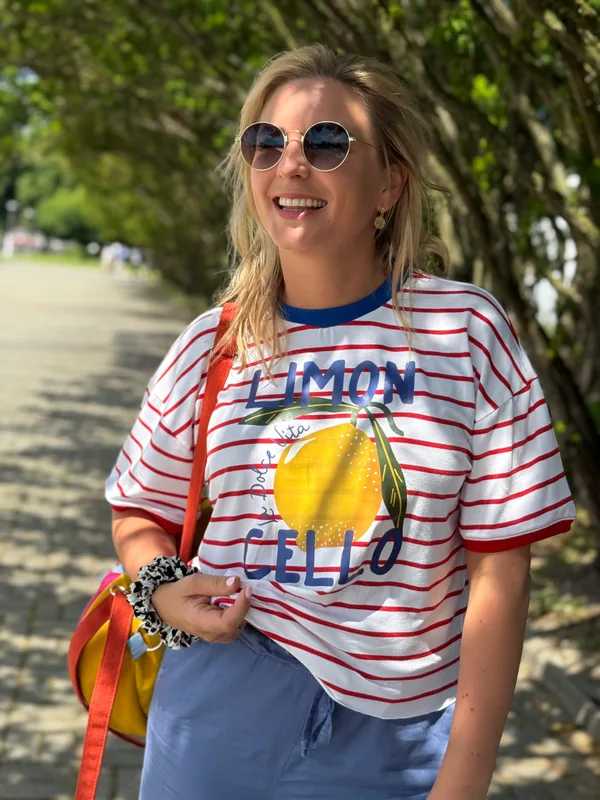 T-shirt „Limone” – cytrynowy akcent w stylu dolce vita 🍋 Poczuj klimat włoskiego lata z T-shirtem „Limone”! Uszyty w Polsce z miękkiego jerseyu wiskozowego, zapewnia wygodę i świeży, energetyczny wygląd. Czerwono-białe paski i nadruk soczystej cytryny wprowadzą Cię w słoneczny nastrój – niezależnie od pory roku. Dlaczego warto? ✨ Wysokiej jakości jersey wiskozowy – lekki, oddychający, przyjemny w dotyku 🇵🇱 Uszyty w Polsce – z dbałością o detale i jakość wykonania ✂️ Szyjemy na zamówienie – możesz dopasować rozmiar i długość do swoich potrzeb 🍋 Oryginalny nadruk – cytrynowy motyw i napis “La Dolce Vita” to kwintesencja letniego luzu Idealny do jeansów, spódnicy czy szortów – „Limone” to must-have w Twojej letniej garderobie! Długość standard: 60cm Dostępne rozmiary: XS/S szerokość 55cm M/L szerokość 59cm L/XL szerokość 63cm