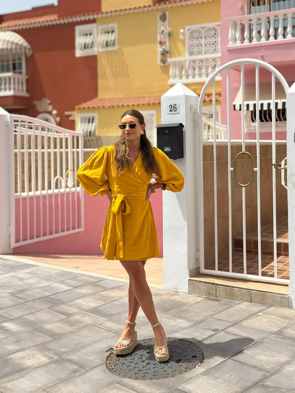 Sukienka Kaja „Soczyste Mango” – Letnia Energia w Miejskim Stylu Owoc ekskluzywnej kolaboracji marek No Pewnie i Array. Przywitaj lato w kolorze słońca! Sukienka „Soczyste Mango” to idealne połączenie wygody, kobiecości i energetycznej barwy, która przyciąga spojrzenia i dodaje pewności siebie – niezależnie od okazji. 🌿 Opis produktu: Skład : naturalna mieszanka lnu i wiskozy – przewiewna, lekka i komfortowa nawet w największe upały Kolor : intensywny odcień soczystego mango – świeży, tropikalny i absolutnie wakacyjny Fason : kopertowy krój podkreślający talię, z delikatnym wiązaniem z boku Rękawy : długość 3/4, zakończone mankietem z delikatnym marszczeniem – nadają lekkości i elegancji Długość : mini – swobodna, ale kobieca, idealna zarówno do trampek, jak i do espadryli czy sandałów na obcasie. Długość 83cm. 🌞 Idealna do miasta, na urlop, na randkę czy spacer z przyjaciółmi. Stylizuj ją jak chcesz – zawsze będziesz wyglądać świeżo i z klasą. Rozmiary dostępne: S / M / L Uszyta w Polsce | Limitowana edycja | Brak możliwości personalizacji