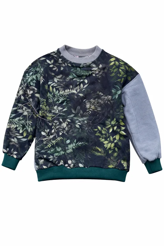 USZYTA I GOTOWA DO WYSYŁKI Bluza patchwork dziecko – bluza o kroju oversize z łączonych materiałów. Materiał: 95% bawełna 5 % elastan Rozmiar: 110 Wymiary: szerokość: 42cm długość: 46cm długość rękawa mierzona od szyi: 51cm Tył: szary