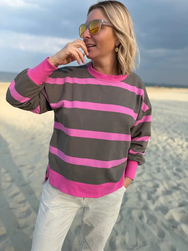 Bluza Wygoda – Bluza Damska Oversize komfort, styl i miękkość w jednym Poznaj Bluzę Wygoda tym razem w różowe paski – idealny wybór na dni, gdy liczy się komfort i modny wygląd. Ta kobieca bluza oversize została zaprojektowana z myślą o wygodzie i stylu. Od środka grubsza pętelka wyjątkowy komfort noszenia przez cały dzień. Główne zalety: Fason oversize – luźny krój gwarantuje pełną swobodę ruchu. Asymetryczna długość – przód krótszy, tył delikatnie wydłużony, co optycznie wysmukla sylwetkę. Rozporki po bokach – dodają lekkości i zwiększają komfort użytkowania. Elastyczne mankiety – utrzymują rękawy na miejscu i nadają bluzie schludny wygląd. Naturalny materiał – skład: 97% bawełna 3% elastan gramatura: ok. 270g/m2 Bluza Damska Oversize dostępna jest w jednym wzorze. Wzór: Paski są ułożone regularnie i rytmicznie na całej powierzchni. Brązowe pasy są około dwa razy szersze niż różowe, co nadaje całości spokojniejszy, bardziej zbalansowany wygląd. Linie są proste i czyste — wzór jest nowoczesny, ale inspirowany klasyczną marynarską estetyką. Kolory: Główny kolor to zgaszony, ciepły brąz (lekko przydymiony, matowy odcień). Kontrastuje z nim intensywny, nasycony róż — żywy, energetyczny, wpadający w fuksję. Połączenie daje efekt: sportowy, świeży i wyrazisty, ale dzięki stonowanemu brązowi nie jest krzykliwe. Tabela wymiarów (mierzone na płasko): Bluza ma oversizowy krój więc szyjemy ją tylko w trzech rozmiarach: sprawdź wymiary poniżej. Wymiary na płasko: szerokość bluzy S – 59 M – 62 L – 65 Na zdjęciach bluzy w rozmiarze S/M
