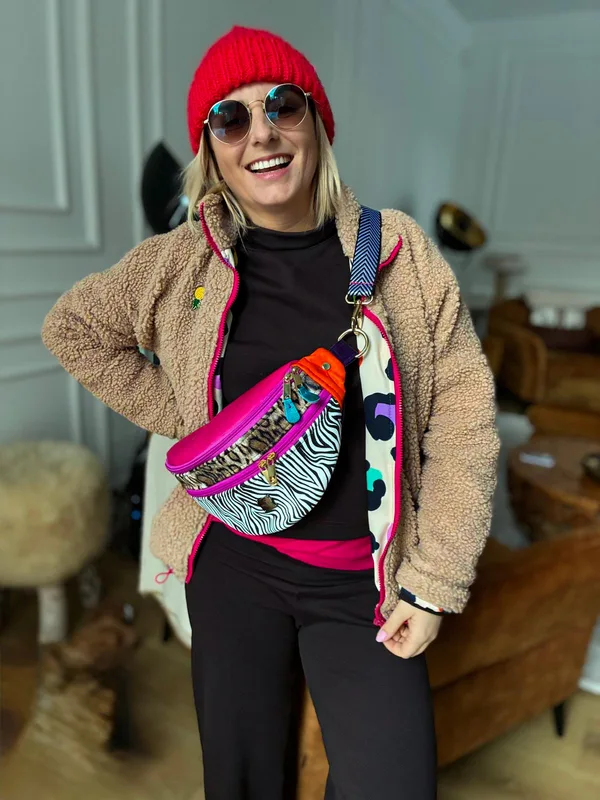 Nerka z dwoma zameczkami Wyrazista i niepowtarzalna nerka dla osób, które lubią odważne dodatki. Połączenie intensywnych kolorów i zwierzęcych motywów sprawia że świetnie podkręci nawet najprostszą stylizacje. Uszyta z wysokiej jakości ekoskór oraz trwałych tkanin tapicerskich – solidna, wygodna i gotowa na codzienne wyzwania. W środku znajduje się praktyczna kieszonka na zamek, idealna na drobiazgi. Regulowany pasek pozwala nosić ją klasycznie w pasie lub modnie – na skos przez ramię. Idealna na spacer, festiwal, zakupy czy jako mocny akcent do minimalistycznej stylizacji. Każdy egzemplarz szyty jest z dbałością o detale – to produkt handmade, który podkreśli Twój indywidualny styl.