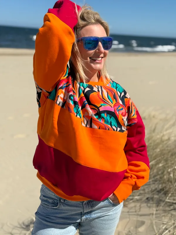 Uszyta i gotowa do wysyłki. Model: Bluza o szerszym kroju z opuszczoną linią ramion. Kolor: abstrakcja na beżu + pomarańcz + czerwony Rozmiar: L Wymiary: Materiał: jednolite dresówki są z meszkiem 97% bawełna 3% elastan, wzorzysta z pętelką pod spodem 95% bawełna 5% elastan Produkt dostępny od ręki. Wysyłka 1-2dni.