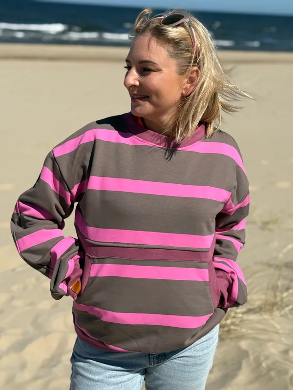 Uszyta i gotowa do wysyłki. Model: Bluza o szerszym kroju z opuszczoną linią ramion. Kolor: różowe paski na chłodnym ciemnym beżu + malaga Rozmiar: L Wymiary: Materiał: jednolita dresówka jest z meszkiem 97% bawełna 3% elastan, w paski z pętelką pod spodem 100% bawełna Produkt dostępny od ręki. Wysyłka 1-2dni.