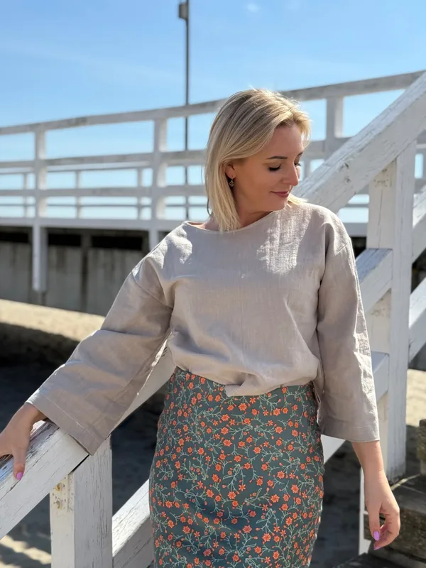 Lniana bluza – naturalna prostota i komfort Lniana bluza to esencja swobodnej elegancji i ponadczasowego stylu. Zaprojektowana z myślą o codziennym komforcie, doskonale wpisuje się w rytm letnich dni – lekkich, ciepłych i pełnych słońca. To model, który łączy minimalizm z funkcjonalnością, tworząc bazę do wielu stylizacji. Naturalny materiał – 100% len Bluza została uszyta w 100% z lnu – tkaniny cenionej za swoją przewiewność, trwałość i naturalne właściwości termoregulacyjne. Len pozwala skórze oddychać, dzięki czemu sprawdza się nawet w najcieplejsze dni. Jego charakterystyczna, lekko surowa struktura nadaje całości autentycznego, szlachetnego wyglądu. Luźny krój – swoboda noszenia Model ma prosty, luźny fason, który nie opina sylwetki i daje pełną swobodę ruchów. Delikatnie opadająca linia ramion oraz wygodny krój sprawiają, że bluza dobrze układa się na różnych typach sylwetek. To idealna propozycja dla kobiet, które cenią komfort bez rezygnacji z estetyki. Szerokie rękawy – nowoczesna forma Charakterystycznym elementem są szerokie, lekko skrócone rękawy, które nadają bluzie nowoczesnego, minimalistycznego charakteru. Dzięki nim całość zyskuje lekkość i wyrazistość, a jednocześnie pozostaje niezwykle wygodna w noszeniu. Uniwersalny design – łatwa stylizacja Stonowany, naturalny kolor sprawia, że bluza doskonale komponuje się zarówno z wzorzystymi elementami garderoby, jak i klasycznymi, gładkimi formami. Możesz zestawić ją ze spódnicą, lnianymi spodniami lub jeansami – w każdej wersji będzie wyglądać spójnie i stylowo. Szczegóły produktu: luźny, prosty krój szerokie, skrócone rękawy naturalna tkanina 100% len długość standard 56cm dwa rozporki po bokach Wymiary na płasko: szerokość bluzy XS/S – 56 S/M – 59 M/L – 62 L/XL – 65 To bluza, która zostaje w szafie na długo – ponad sezonami, ponad trendami.