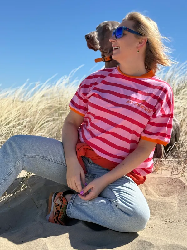 T-shirt w paski No Pewnie Lover – świeżość i energia na co dzień Ten T-shirt to esencja letniego luzu i pozytywnej energii. Wyrazisty wzór w poziome paski w odcieniach różu i czerwieni przyciąga uwagę, a kontrastowe, pomarańczowe wykończenia przy dekolcie i rękawach dodają całości charakteru. To model, który świetnie wpisuje się w casualowe stylizacje, ale równie dobrze sprawdzi się jako mocniejszy akcent w bardziej minimalistycznym looku. Komfort, który czuć od pierwszego założenia Koszulka została zaprojektowana z myślą o wygodzie. Miękki, przyjemny w dotyku materiał zapewnia komfort noszenia przez cały dzień – niezależnie od tego, czy spędzasz czas na mieście, czy odpoczywasz na plaży. Luźniejszy krój nie krępuje ruchów i dobrze układa się na sylwetce, dając swobodny, niewymuszony efekt. Detale, które robią różnicę Na piersi T-shirtu w paski znajduje się subtelne logo „No Pewnie” z małym serduszkiem – delikatny akcent, który podkreśla unikalny charakter produktu. Starannie dobrane kolory i wykończenia sprawiają, że T-shirt wyróżnia się na tle klasycznych modeli, zachowując przy tym uniwersalność. Stylizacje bez wysiłku T-shirt w paski to idealna baza do wielu outfitów. Noś go z jeansami dla klasycznego, codziennego looku lub zestaw z lnianymi spodniami i sandałami, aby stworzyć wakacyjną stylizację. Świetnie wygląda również warstwowo – np. z bluzą lub lekką kurtką zarzuconą na ramiona. Dlaczego go pokochasz? Jeśli szukasz T-shirtu, który łączy wygodę z wyrazistym designem, ten model będzie strzałem w dziesiątkę. To propozycja dla osób, które lubią modę z charakterem, ale nie chcą rezygnować z komfortu. Idealny na lato – i nie tylko. Długość standard: 60cm Dostępne rozmiary: XS/S szerokość 55cm M/L szerokość 59cm L/XL szerokość 63cm