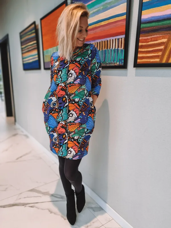 Casualowa propozycja dla każdej kobiety. Krój – gruszka – dopasowana góra z małym dekoltem i mocno obszerna na wysokości bioder z dwoma kieszeniami, długość rękawa do wyboru. Genialny, codzienny materiał jersey (bawełna + elastan) w wielu wzorach do wyboru. Modelka na zdjęciu w sukience w skrzdła motyli ma na sobie rozmiar S. Wymiary: szerokość w ramionach (od szwu do szwu) / szerokość na wysokości bioder (w najszerszym miejscu) dla konkretnych rozmiarów: XXS 30cm/55cm XS 32cm / 58cm S 34cm/ 60cm M 35cm / 62cm L 36cm/ 64cm XL 37cm / 66cm XXL 58cm 38cm / 68cm