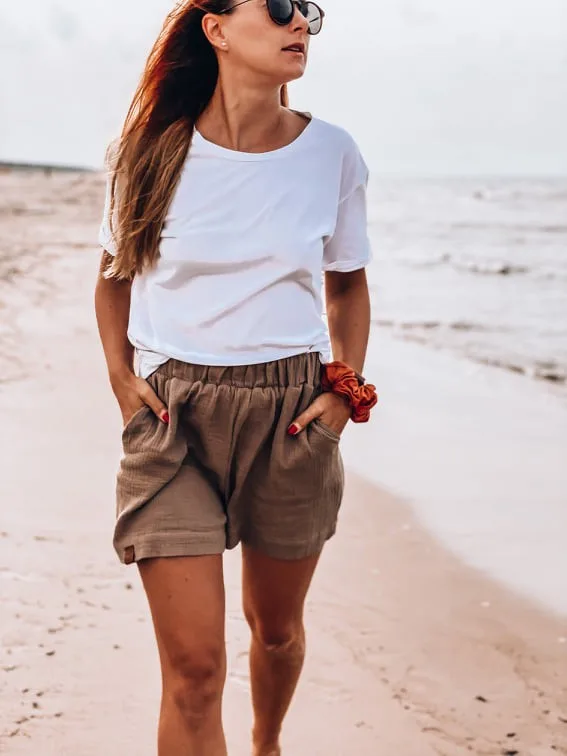 Lekkie, przewiewne i niezwykle uniwersalne spodenki. Szorty damskie uszyte z muślinu (100% bawełna) z dwiema kieszeniami i na gumce, ozdobione metką No Pewnie. Przy wyborze rozmiaru kieruj się wymiarem bioder. Długość możesz zmienić. Standardowo szorty mają 35cm długości. Wolisz dobrać rozmiar porównując do innych Twoich spodenek? Nie ma problemu! Poniżej szerokość spodenek na wysokości bioder dla konkretnych rozmiarów: XS 49cm S 51,5cm M 53,5cm L 55,5cm XL 58cm XXL 59,5cm Zamawiając produkt, nie kupujesz gotowego, szyjemy to specjalnie dla Ciebie.