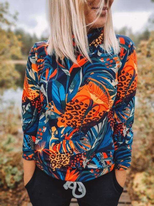 Golf damski dresowy bez dodatku poliestru. Prosta forma – bluzka z długim rękawem, z golfem, który ładnie kryje szyję ale jej nie obciska. Wywijany. Cała forma bluzki jest raczej luźniejsza – jeśli chcesz, aby była bardziej dopasowana – wybierz rozmiar mniejszy niż wynika z tabeli. Wybierz wzór taki jaki pasuje do Ciebie. Modelka ma na sobie rozmiar s, wzór malowane lilie oraz rajskie kwiaty zgodny z tabelą rozmiarów, jeśli wolisz golfik dopasowany – wybierz rozmiar mniejszy niż wynika z tabeli. Podajesz wzrost – po co? Żebyśmy mogły uszyć dla Ciebie bluzkę odpowiedniej długości i żeby rękawy nie były za krótkie. Składając zamówienie nie kupujesz gotowego produktu – szyjemy go specjalnie dla Ciebie. Składając zamówienie akceptujesz regulamin sklepu.