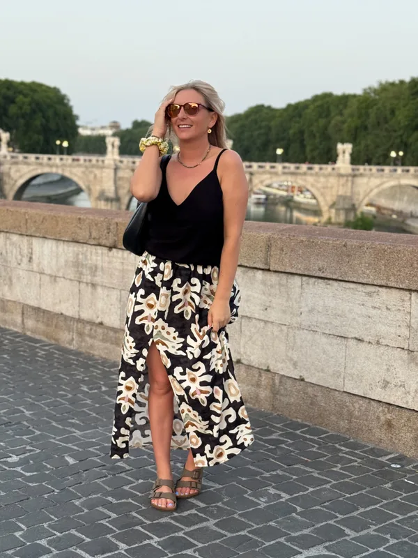 Długa spódnica „Powiew Lata” 🌿 Co czyni tę spódnicę wyjątkową? Wzór „Afryka” to prawdziwa eksplozja kolorów: ciepłe barwy, egzotyczne liście i artystyczny vibe – idealna na lato, festiwale i miejskie spacery. Wiskoza 100% – naturalna, przewiewna, nie prześwituje, układa się miękko. Bezproblemowa w noszeniu. Gumka w pasie + głęboki rozporek – wygoda i kobiecy sznyt. Możesz go stylizować na wiele sposobów (z przodu, z boku czy z tyłu – Twoja decyzja!). 🤸♀️ Stylizacje: Dodaj biały top, sandały albo espadryle i jesteś gotowa od zachodu słońca aż do nocy. Wieczorem – szpilki i ramoneska i masz look total party. Pasuje też świetnie do topu z tego samego wzoru lub koszuli – totalne duo, czyli jak sukienka. 🧼 Pielęgnacja: Prać ręcznie w max. 30 °C – wiskoza lubi delikatne traktowanie. Uwaga na suszarkę – żeby kolory zostały intensywne, lepiej schnąć naturalnie. Wygoda i kobiecy styl w jednym – dzięki gumce i rozporkowi. Nietuzinkowy wzór ze zdjęcia „Afryka” – przyciąga spojrzenia i daje luz. Lekka wiskoza – doskonała na gorące dni. Możliwość personalizacji długości – szyjemy specjalnie dla Ciebie. Modelka ma na sobie rozmiar M , długość 96 cm (trochę dłużej niż standardowe 94 cm) – efekt? Zwiewny, lekki look i mega wygoda. 💬 Jeśli masz pytania o długość, wzór lub styl – śmiało pisz. Chętnie doradzimy! No pewnie, że warto ją mieć! 😊