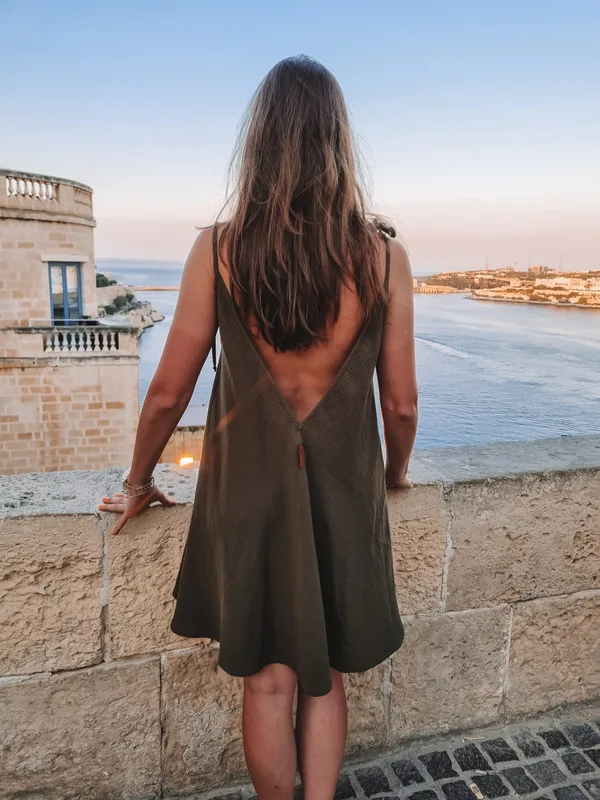 SUKIENKA VALLETTA Stolica Malty – Valletta – przepiękna, gorąca, zachwycająca… Zainspirowała nas do ofotogarfowania naszej nowej sukienki z dwoma dekoltami V – stąd jej nazwa. . Vallettę szyjemy z Waszego ukochanego double gaze – potocznie nazywanym muślinem, do wyboru sporo kolorów. Dzięki wiązaniom na ramionach możesz regulować głębokość dekoltów. Krój trapezowy. . Ula i Madzia mają na sobie sukienkę w rozmiarze S w kolorze grafitowym i khaki. . Jak wybrać rozmiar? Zmierz obwód biustu i dobierz: xs – obwód 82- 86cm s /m – obwód 87 – 94cm l – obwód 95 – 102cm xl – większy obwód (podaj w uwagach do zamówienia) Składając zamówienie nie kupujesz gotowego produktu – szyjemy go specjalnie dla Ciebie. Składając zamówienie akceptujesz regulamin sklepu.